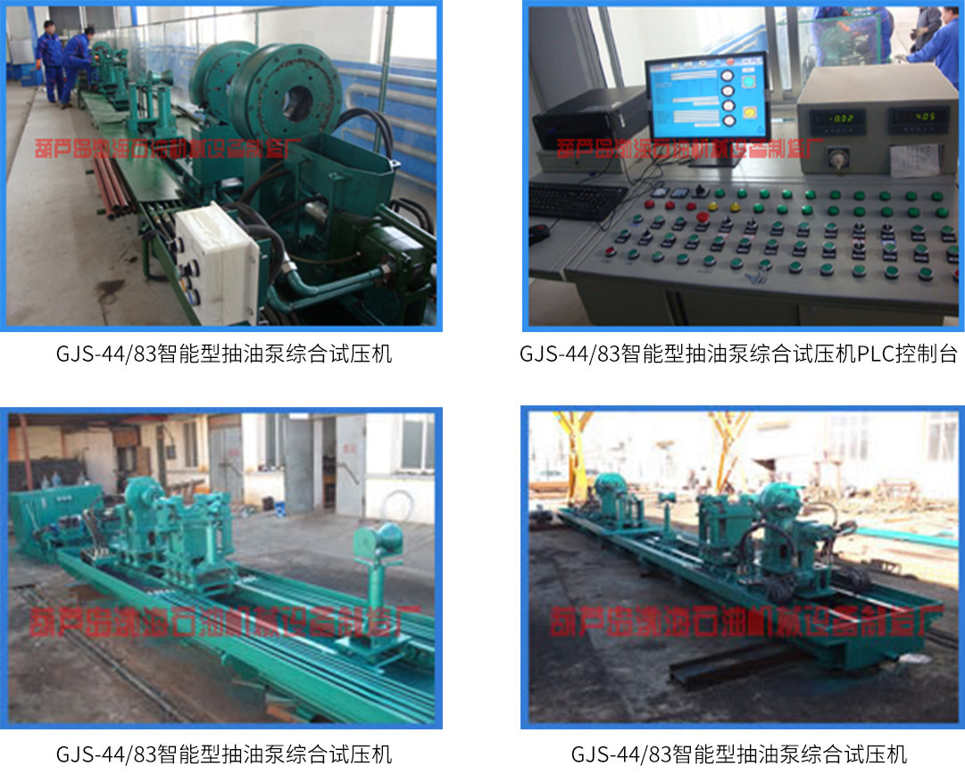 GJS-44/83智能型抽油泵綜合試壓機(jī)是我廠新研制的抽油泵試壓機(jī),主要用于舊抽油泵拆裝和新舊抽油泵檢測(cè)(壓力檢測(cè)和漏失量檢測(cè))。試壓過程由PLC自動(dòng)控制,漏失量自動(dòng)計(jì)量。計(jì)算機(jī)顯示壓力、扭矩、漏失量數(shù)據(jù),且具有自動(dòng)儲(chǔ)存、報(bào)表、打印等功能。